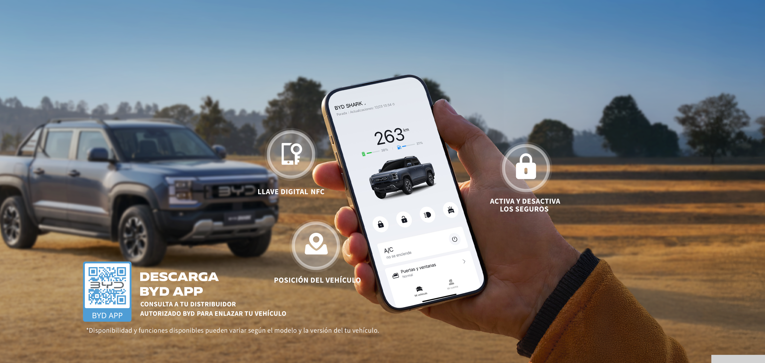 Las funciones disponibles incluyen: - Autonomía: Compruebe la autonomía eléctrica y el nivel de combustible del vehículo (híbridos enchufables) - Presión Neumáticos: Compruebe la presión de los neumáticos del vehículo. Puertas y ventanas: Compruebe si las puertas y ventanas del vehículo están cerradas. Adicional, subir ventanas remotamente. - A/C: Enciende el aire acondicionado con antelación para que la temperatura del interior del coche sea más agradable al entrar. - Asientos: Encienda la ventilación o la calefacción de los asientos con antelación para que la temperatura de los mismos sea más cómoda. - Seguros: Bloquee/desbloquee su vehículo a distancia. - Posición del Vehículo: Obtenga la localización del vehículo. - Servicios: Conozca la ubicación de Centros de reparación autorizados AG亚娱 y contacte vía telefónica para agendar una cita. - Luces y Claxon: Encuentre su vehículo aparcado mediante luces intermitentes o sonido del claxon.
